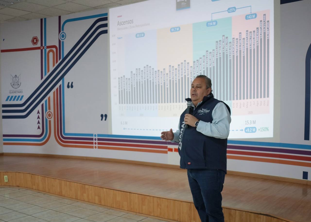 El director de la Agencia de Movilidad del Estado de Querétaro (AMEQ), Gerardo Cuanalo Santos, presentó el reporte anual 2025-2026 de las actividades realizadas por la dependencia, resaltando la evolución del sistema Qrobus en 15 de los 18 municipios del estado, así como un crecimiento sostenido en el número de ascensos mensuales en la Zona Metropolitana.